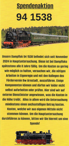 LIEBER BESUCHER Ich möchte ihnen hier einmal einen Einblick geben was die Vereinsmitglieder so leisten damit die 94 1538 bald wiederden Thüringer Wald befahren kann und das Herz der Fans von der 94 1538 sowie der Steilstrecke wieder höher schlägt.